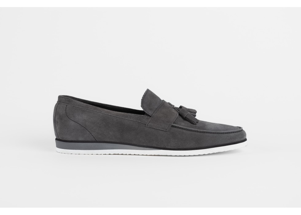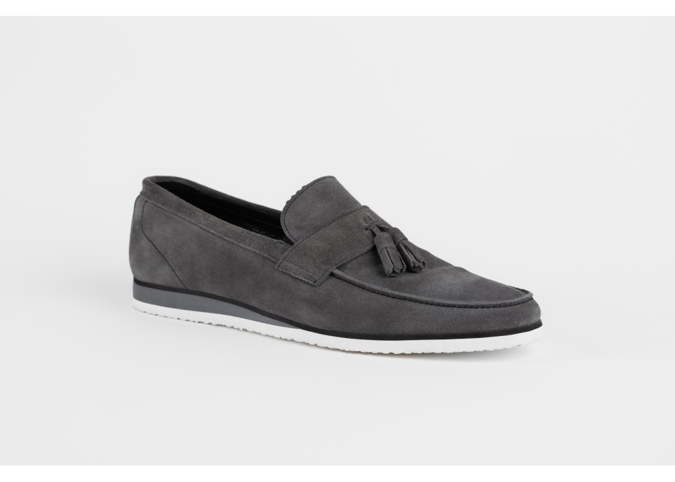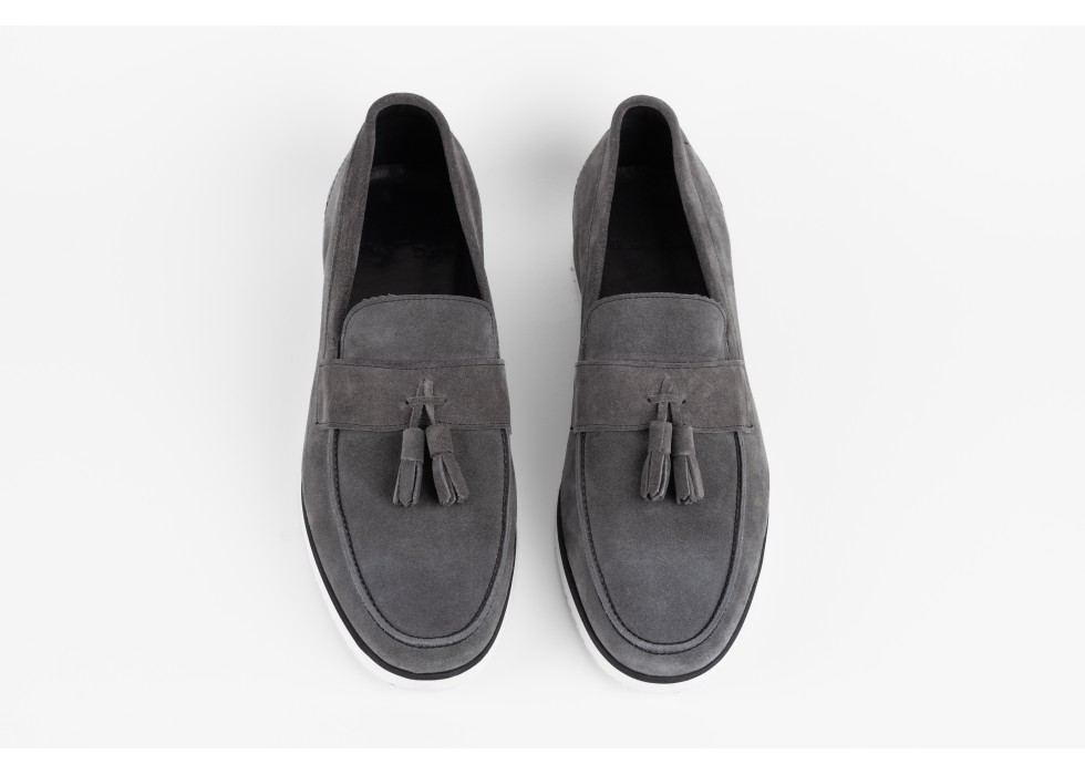 Pantofi slip-on din pânză gri, cu talpă albă și inserție elastică neagră pentru confort sporit. Acești pantofi sunt ideali pentru un look casual și relaxat, oferind un stil modern și practic.